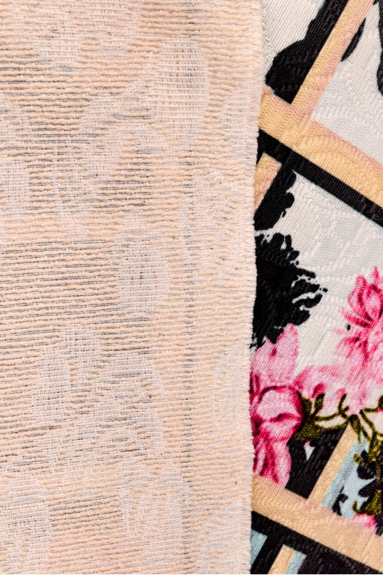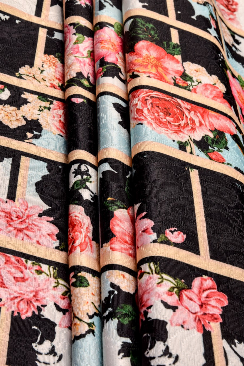 Italian jacquard costume fabric with an embossed rose flower motif. In addition, the fabric has a beige and black check print of about 10 cm with colorful rose flowers. The whole creates a pergola motif with climbing flowers that cast black shadows. The fabric has a tight, jacquard weave, is inelastic and slightly stiff. It is perfect for sewing a skirt, coat or costume. The combination of natural and synthetic fibers makes it comfortable to wear and durable.