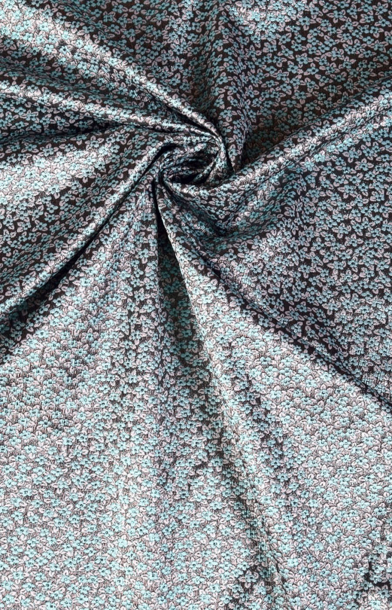 Elegant jacquard with a small pattern of meadow flowers. The fabric is slightly stiff and light, with a sheen. Perfect for jackets, dresses, skirts and thin formal coats.