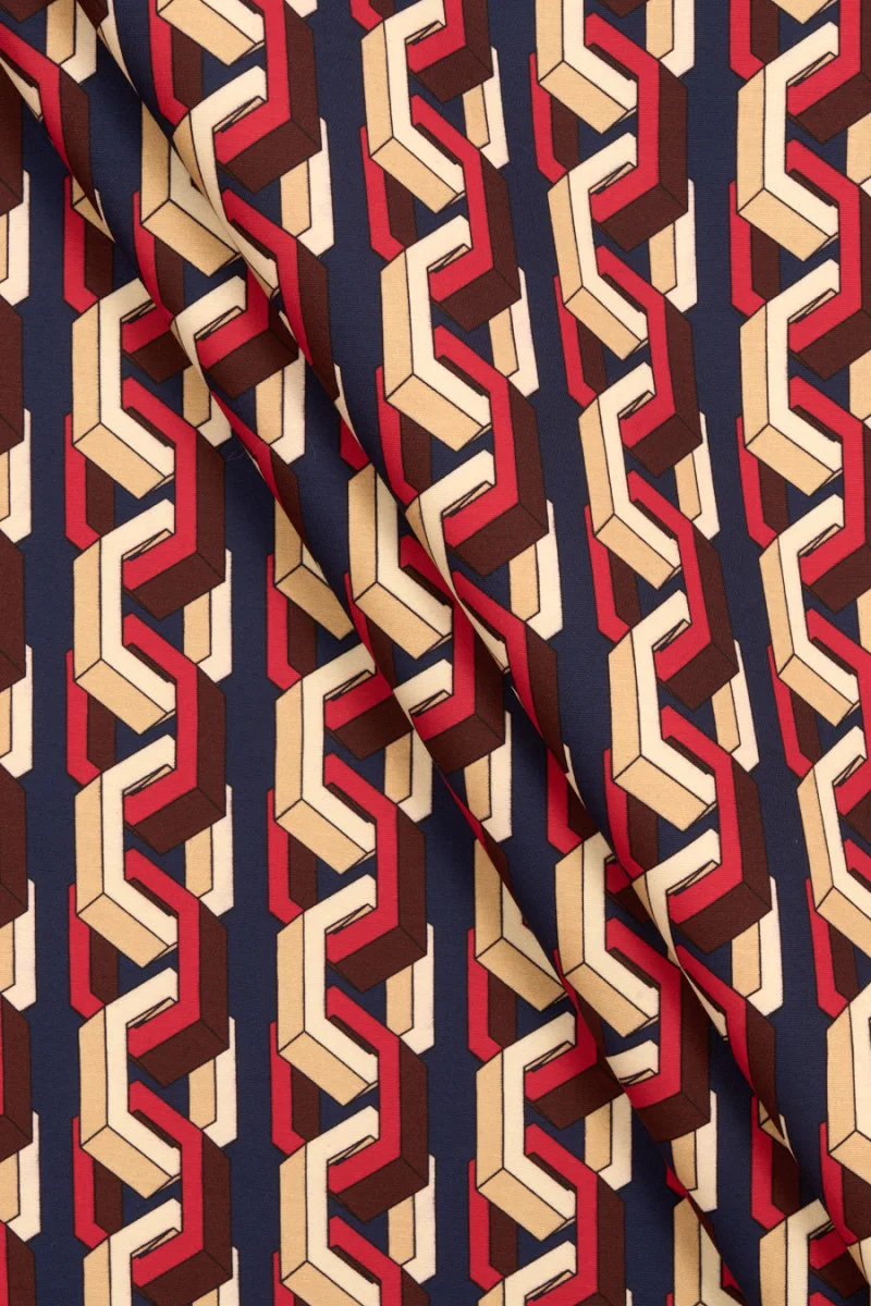 Itaalia cadi kangas, mis on kootud siidi ja polüestri segust punaste ja beežide kettide motiiviga tumesinisel taustal. Kangas on lihav, elastne, kergelt jäik. Huvitav ettepanek pükste, jakkide, lühikeste pükste ja kleitide jaoks.