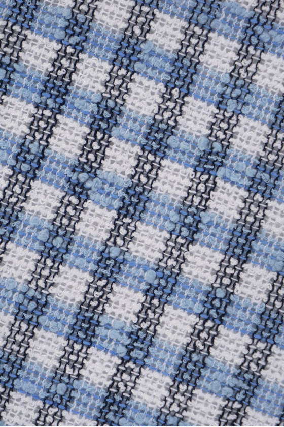 Lõdvalt kootud, suvine chaneli kangas. Muster on kootud valge ja sinise tšekiga, mille suurus on 2,5x2,5 cm, tumesinise põimimisega.