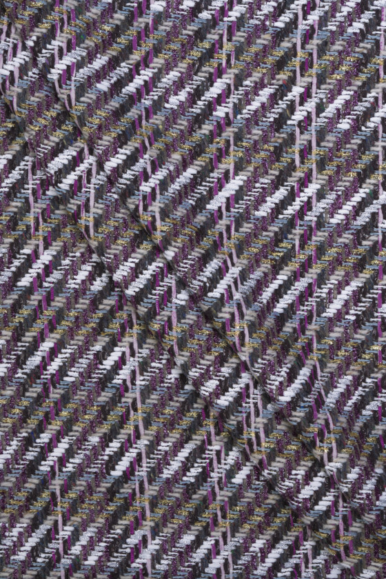 Itaalia chaneli kostüümikangas hallis, écru ja lillas. Kergelt kumera struktuuriga kangas ja lõdvem, uhke kudumine, mis loob kontrollmotiivi. Kangas on delikaatselt kaunistatud läikiva niidiga, mis lisab sellele elegantsust. Kangas on valmistatud peamiselt looduslikest kiududest, mistõttu on seda väga mugav kanda ja sünteetilise niidi lisamine muudab selle vastupidavamaks ja ei kortsu. Fantastiline ettepanek kõige moodsamates värvides tweed-riiete fännidele.