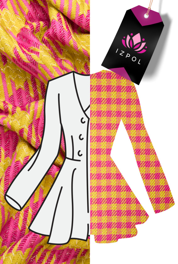 Itaalia chaneli kostüümikangas lubja ja roosaga, tiheda kudumiga, mis on kaunistatud kuldse lurex-niidiga. Kangas on valmistatud peamiselt looduslikest kiududest, seega on seda väga mugav kanda, pehme ja sünteetilise niidi lisamine muudab selle vastupidavamaks ja ei kortsu. Ilus ettepanek inimestele, kellele meeldivad energeetilised värvid.