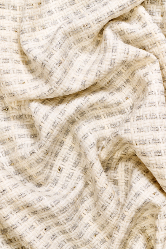 Itaalia chaneli kostüümikangas ekru halli, horisontaalse põimimisega, mis on kaunistatud kuldse, läikiva niidiga, mis lisab sellele elegantsust. Kangas on peamiselt valmistatud looduslikest kiududest, seetõttu on seda väga mugav kanda, pehme ja elastne. Fantastiline ettepanek heledates, pastelsetes toonides tweed-riiete fännidele.