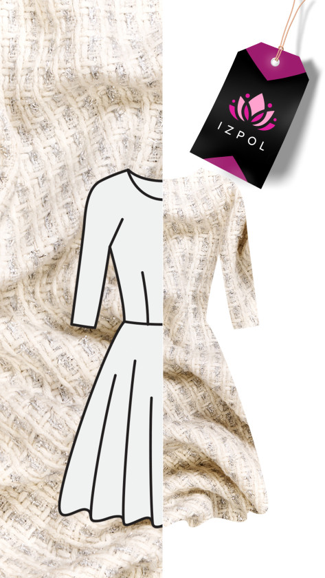 Kreemikas Itaalia chaneli kostüümikangas, millel on helehall, horisontaalne põimitud hõbedane läikiv niit, mis lisab sellele elegantsi. Niidid moodustavad peene ja õrna kontrolli mustri. Kangas on peamiselt valmistatud looduslikest kiududest, seetõttu on seda väga mugav kanda, pehme ja elastne. Fantastiline ettepanek heledates, pastelsetes toonides tweed-riiete fännidele.