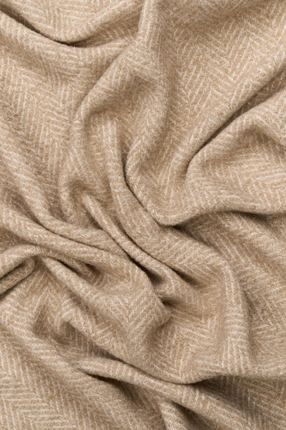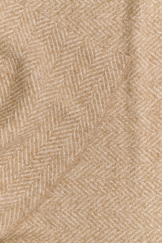 Itaalia chaneli kangas beežis ja kreemiga, mis on kaunistatud kuldse lurex niidiga, kootud kalasaba mustriga. Sügis- ja talveliikide kangas, paksem, pehme, valmistatud peamiselt looduslikest kiududest, mistõttu on seda väga mugav kanda ja villa lisamine muudab selle soojemaks. Ettepanek inimestele, kellele meeldib klassikaline, ajatu disain, sobib suurepäraselt õhukese mantli, jope või jope õmblemiseks.