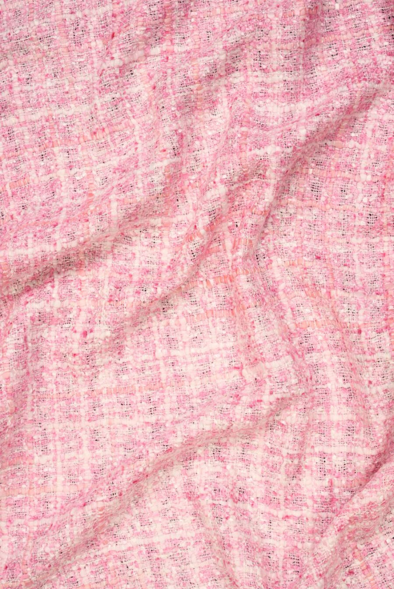 Itaalia chaneli kostüümikangas roosa ja valge värviga. Kergelt kumera struktuuriga ja ruudulise mustri moodustava lõdvema koega kangas, mis on valmistatud peamiselt looduslikest kiududest, mistõttu on seda väga mugav kanda, pehme, mitteelastne. See sobib suurepäraselt nii elegantsete kui ka igapäevaste riiete õmblemiseks. Suurepärane pakkumine ajatutes värvides tviidkangaste austajatele.