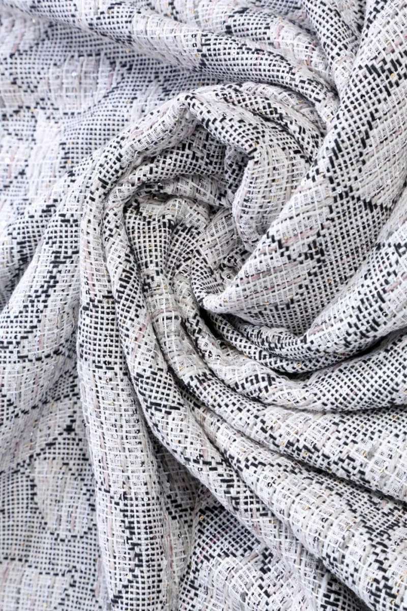 Chaneli lehtkostüümi kangas väikeste litritega. Mõeldud kleitide, seelikute või jakkide jaoks. Kangas on kootud looduslikest kiududest - villast ja viskoosist, mis tagab kandmise mugavuse. Soovitame valida voodri, mille leiate meie poest.