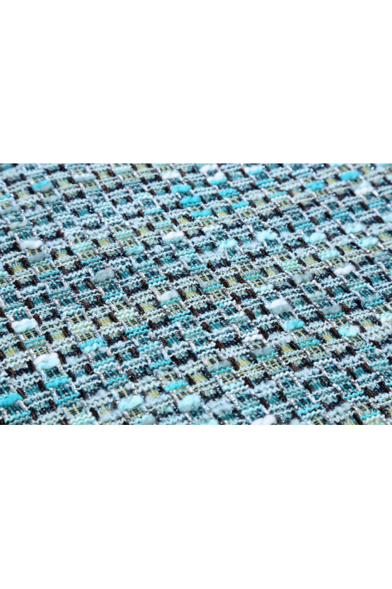 Ilus, klassikaline chaneli kostüümikangas mere-türkiissinise, sinise värviga, millele on lisatud pruun ja valge. Ideaalne selliste komplektide jaoks nagu: jope + seelik või kleidid. Looduslikud niidid nagu vill, puuvill ja viskoos tagavad mugavuse. See nõuab voodri kasutamist, mida saab valida meie poest.