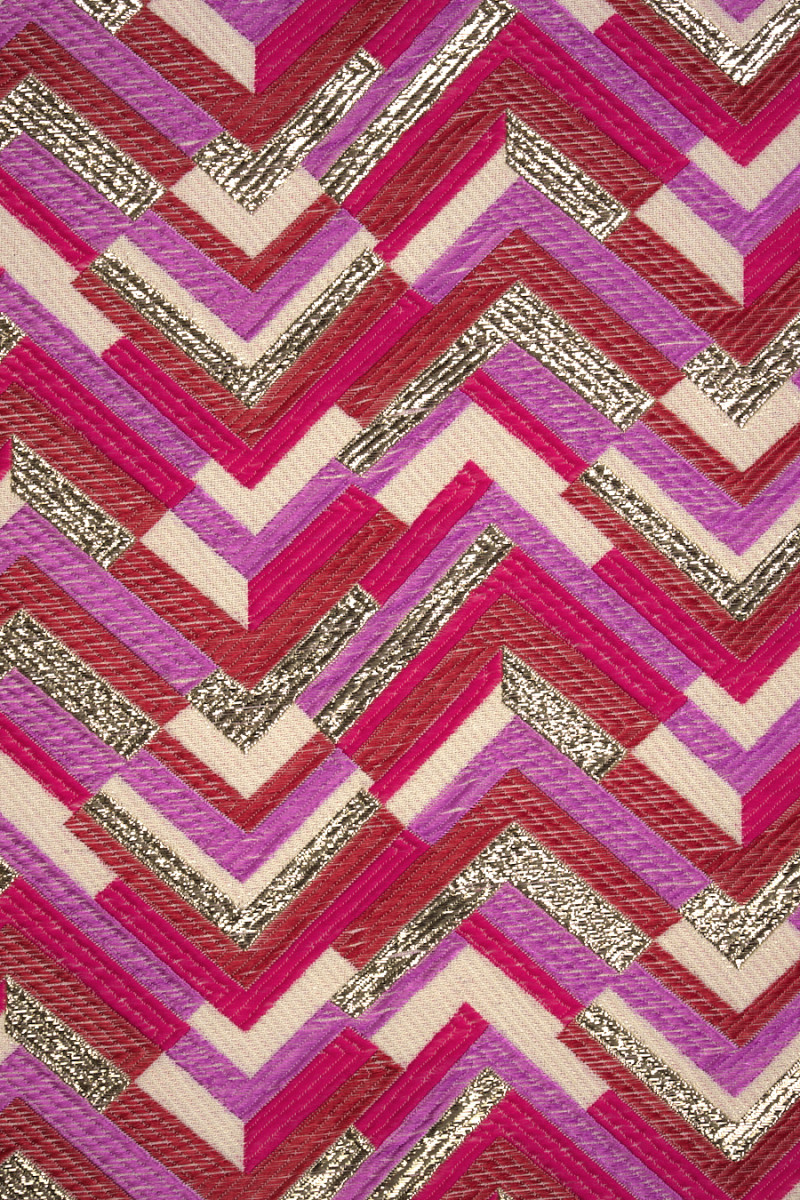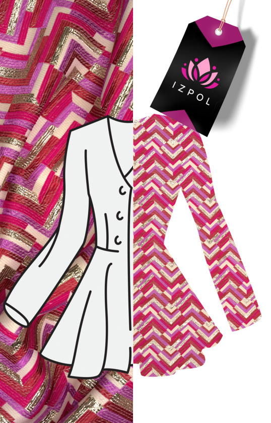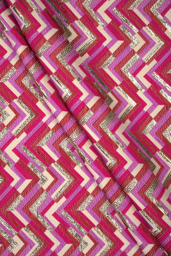 Itaalia jacquardi kostüümikangas värviliste siksakide motiiviga. Kangast hoitakse roosas, lillas ja beežis ning see on lisaks kaunistatud kuldse lurex-niidiga, mis annab sellele elegantsuse. Materjalil on veidi kumer struktuur, see on pehme, keskmise paksusega, läbipaistmatu. Ilus ettepanek kleidi, seeliku ja jope õmblemiseks erilistel puhkudel.
