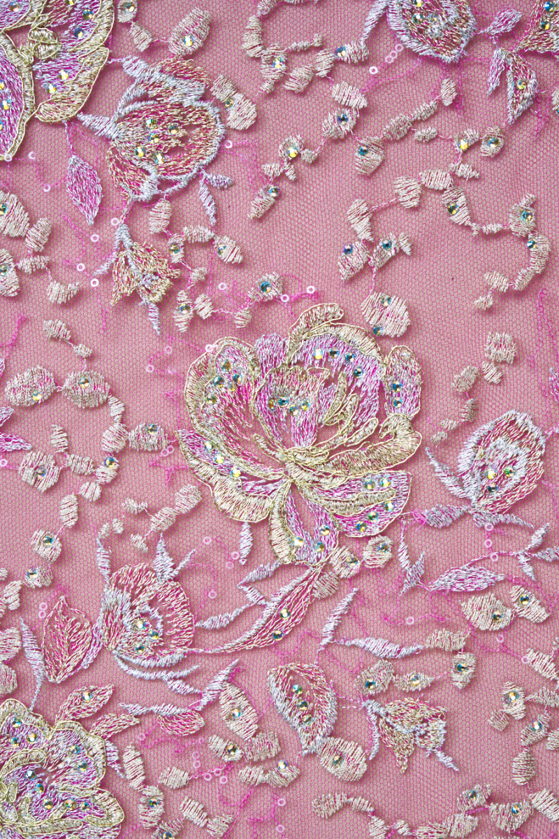 Itaalia jäik tüll klassikaliste roosade aasadega, millel on tikitud kullavärvi roosid ja väikesed kuldlehed, mis on rikkalikult kaunistatud sillerdavate kivide ja väikeste läbipaistvate litritega. Tikandid paksenevad kahe serva suunas, seetõttu soovitame õmmelda ümber perimeetri. Kangas on väga tõhus, läbipaistev (vajab vooderit), mitteelastne ja kerge. Kangale asetatud kivid säravad kaunilt, luues kangale eksklusiivse välimuse. Fantastiline ettepanek õhtukleidi, seeliku või pluusi õmblemiseks väga huvitavas väljaandes.