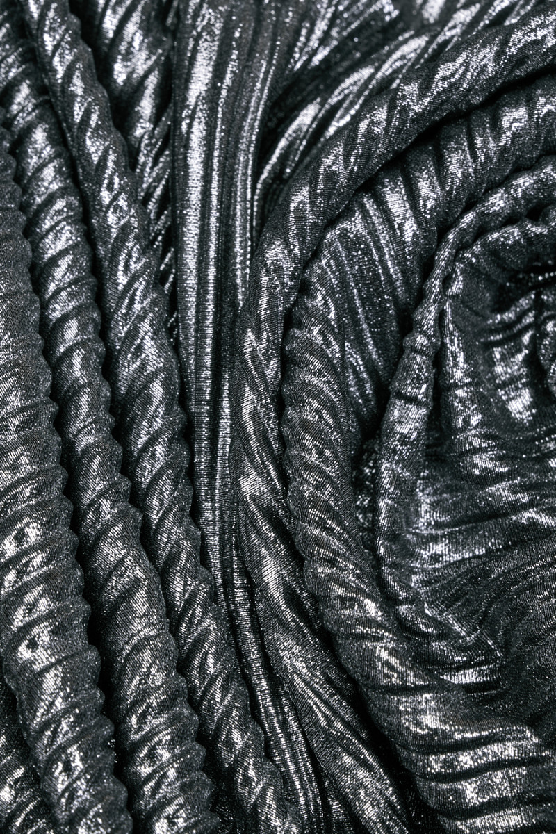 Tõhus, läikiv kangas, mis on peenelt plisseeritud musta ja hõbedaga.