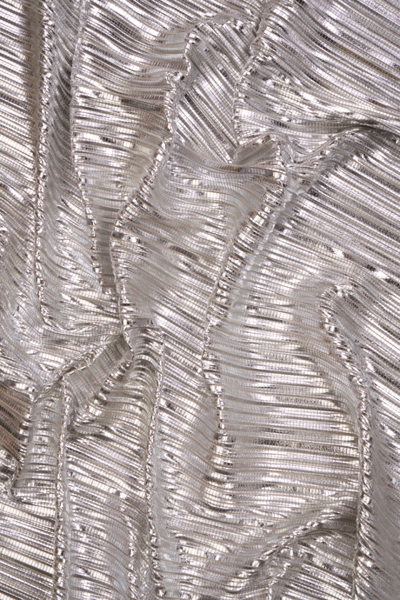 Muljetavaldav beežiga plisseeritud kangas, millel on tihedalt paiknevad, väikesed, läikivad ruudud hõbedas. Kangas on kerge, voolav, intensiivselt läikiv, mis annab talle ainulaadse ja eksklusiivse välimuse. Ideaalne ametlike rõivaste jaoks.