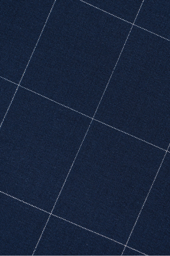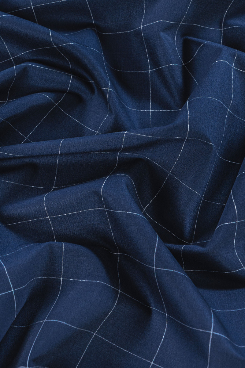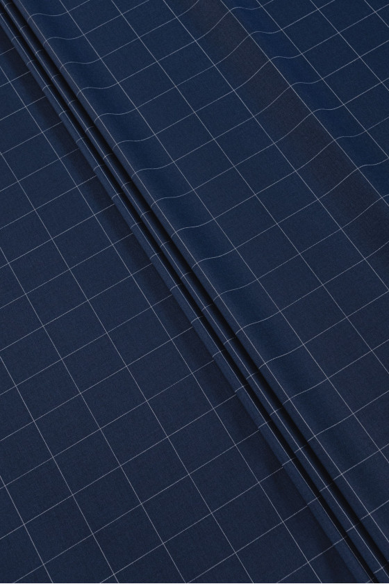 Itaalia kostüümivill mereväe sinises, valge kontrollmotiiviga, suurusega 5 cm * 4 cm. Keskmise paksusega, elastne kangas - ideaalne kleidi, seeliku, ülikonna, pükste õmblemiseks.