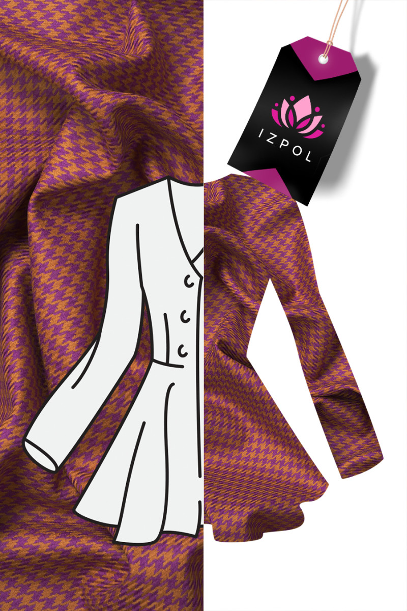 Itaalia kostüümivill lilla ja kaameli kana jalamotiiviga, suurusega 1 cm. Paksem, pehme, mitteelastne sügis-talvine kangas. Ideaalne ülikonna, kleidi, seeliku, pükste või kostüümi õmblemiseks.