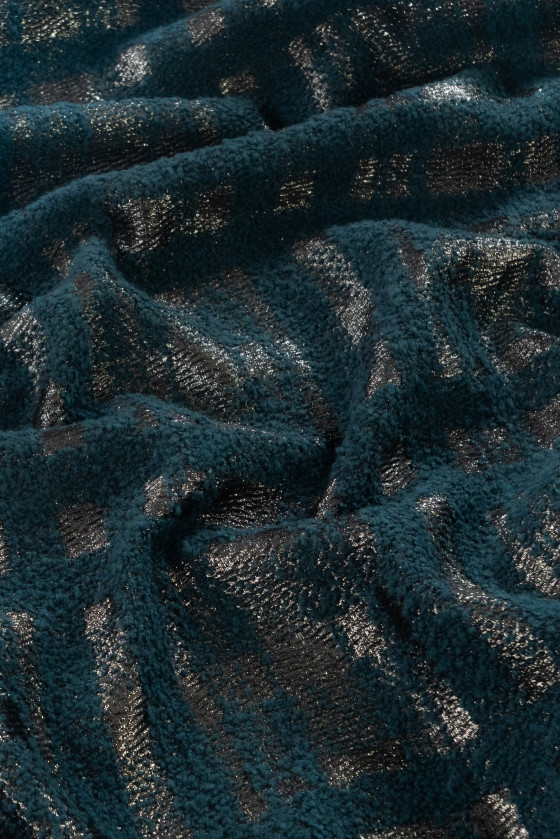 Itaalia bucle kootud kostüümikangas mererohelises hõbedase kontrollmotiiviga. Naturaalsest villast kootud kangas, millele on lisatud lurex niiti, väga tõhus. Ideaalne kostüümi, kleidi, seeliku või õhukese mantli õmblemiseks.