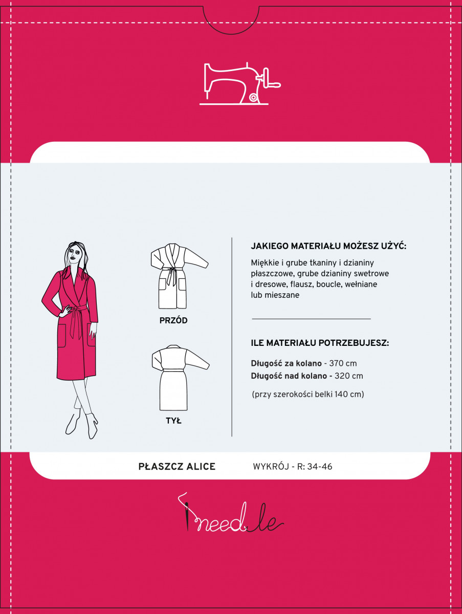 Klassikalise, lihtsa naiste mantli muster, millel on rätikukrae, mille lõige sobib igale naissoost figuurile. Selge, värviline muster aitab teil õmmelda klassikalist mantlit suurusega 34 kuni 44. Alice'i mantlil on lahtine lõige, rätikukrae ja see on seotud vöökohaga. Varrukad on õmmeldud madalamale ja kitsenevad allapoole. Mantlil on kaks plaastritaskut.