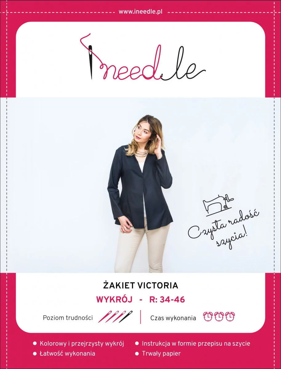 Moodne, taljet rõhutav jope muster, mis on ideaalne viimistlus nii igapäevastele kui ka klassikalisematele rõivastele. Victoria jopet saate kanda pükste, seelikute ja isegi kleitidega. Täiuslikult paigutatud ja märgistatud muster aitab teil õmmelda Victoria jope suurusega 34 kuni 46. Moodsal Victoria jakil on sirge lõikega, puusapikkus ja pikad varrukad. See on kinnitatud õrna, praktiliselt nähtamatu konksuga. Külgmised lõiked rõhutavad õrnalt taljet, mis annab figuuri rafineerimise efekti.