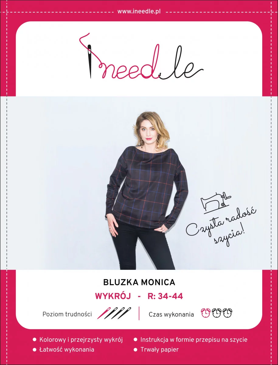 Mustriks paadikujulise kaelusega kimono pluus. Monika pluusil on lihtne, lõdva lõikega ja keskmise puusapikkusega, saate õmmelda kaks versiooni: pikkade ja langetatud varrukatega või lühikeste ja langevate varrukatega. Muster võimaldab teil õmmelda pluusi suurusega 34 kuni 44