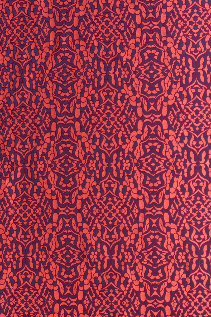 Itaalia jacquardi kostüümikangas, millel on väljamõeldud mustrid tumedas tumesinises ja oranžis Burgundia piiridega. Kangas on lihav, elastne, kergelt jäik. Huvitav ettepanek ainulaadse jope või kleidi õmblemiseks.
