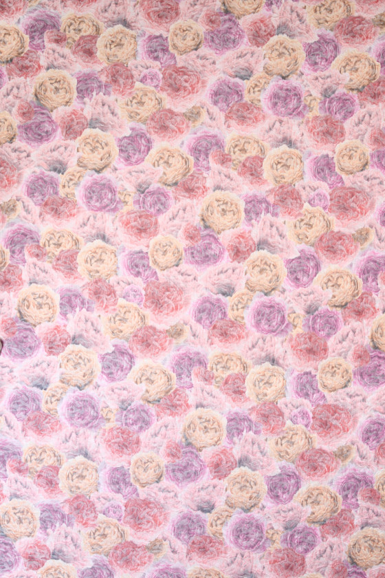 Itaalia jacquardi kostüümikangas suurte korallide, kanarbiku, apelsini ja lõhe roosidega. Kangal on kumer struktuur, see on pehme, läbipaistmatu ja mitteelastne. Roosid on valmistatud erineva suurusega, 8 cm kuni 13 cm. Ilus ettepanek inimestele, kellele meeldib pastell ja klassikaline disain.
