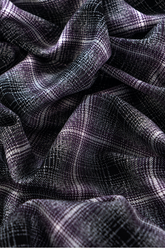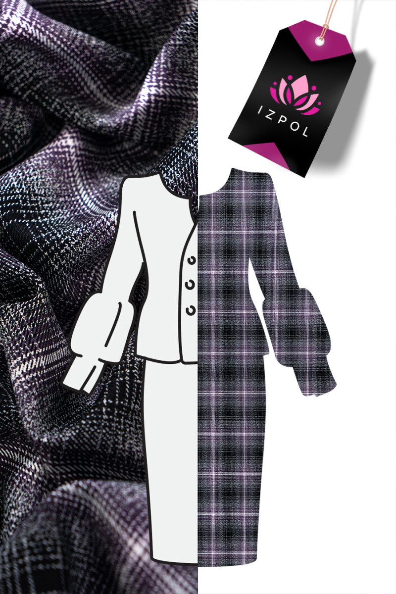 Itaalia kostüümikangas, mille kontrollmotiiv (6 cm) on must, hall ja lilla. Viskoosi, polüestri ja elastaani segu - kudumine sarnaneb villaga.