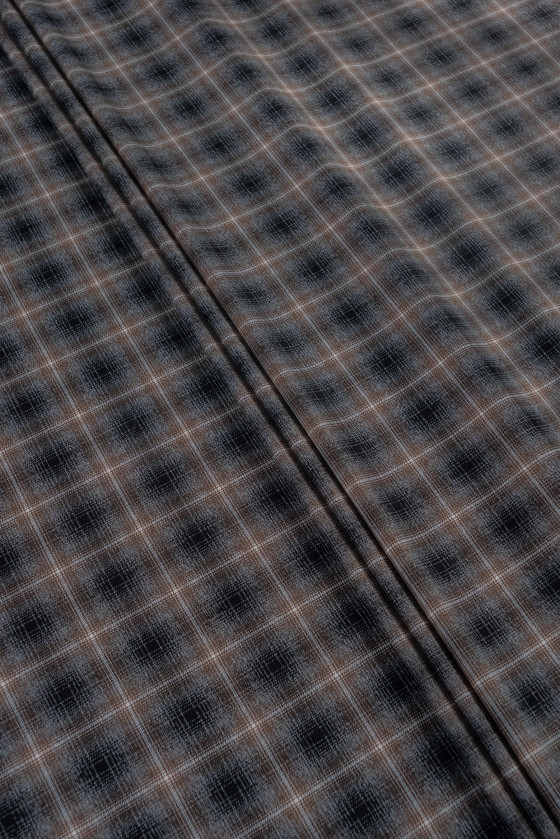 Itaalia kostüümikangas kontrollmotiiviga (6 cm) mustas, hallis ja pruunis. Pehme kangas, millel on tihe kudumine, mis meenutab villa.
