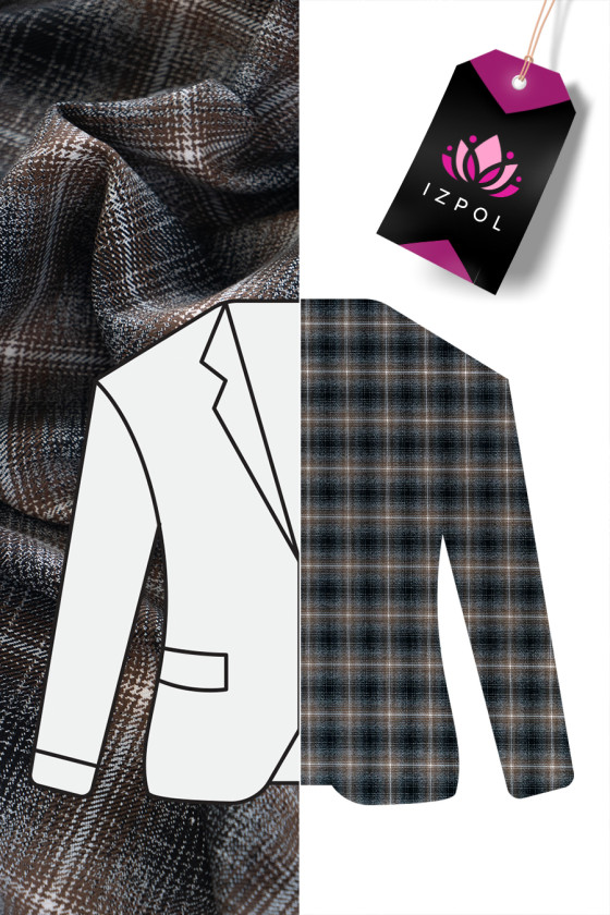Itaalia kostüümikangas kontrollmotiiviga (6 cm) mustas, hallis ja pruunis. Pehme kangas, millel on tihe kudumine, mis meenutab villa. Ideaalne ülikonna, kleidi, pükste või seeliku, jope õmblemiseks.