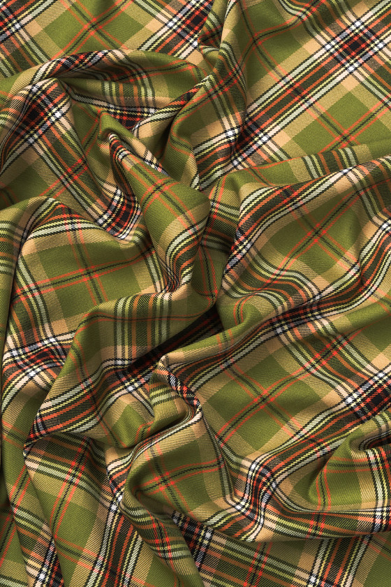 Itaalia kostüümikangas oliivroheline suure ruudulise motiiviga (10 cm) musta ja pruuni värviga. Ilus värvikombinatsioon inimestele, kes ei karda moega mängida ja kellele meeldib originaalne välja näha. Kergelt elastne kangas, millel on kompaktne kude ja sile pind. Fantastiline pakkumine jope, ülikonna, klassikalise kleidi või seeliku õmblemiseks.
