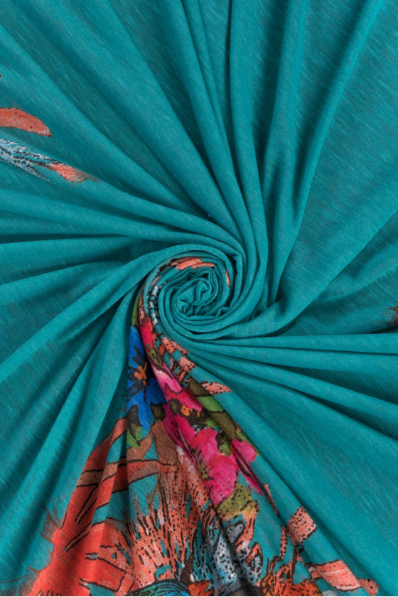 Ilus Itaalia viskoosist silmkoekangas, millel on lilledega ümbritsetud papagoi muster. Värvid: roheline türkiissinine, oranž, roosa, roheline. Elastne kangas, saadaval kupongina mõõtmetega 70*140 cm.