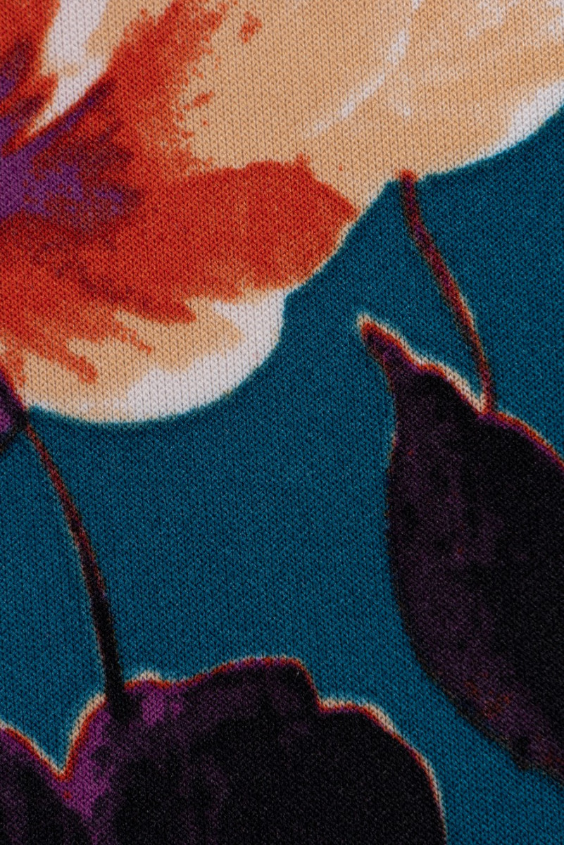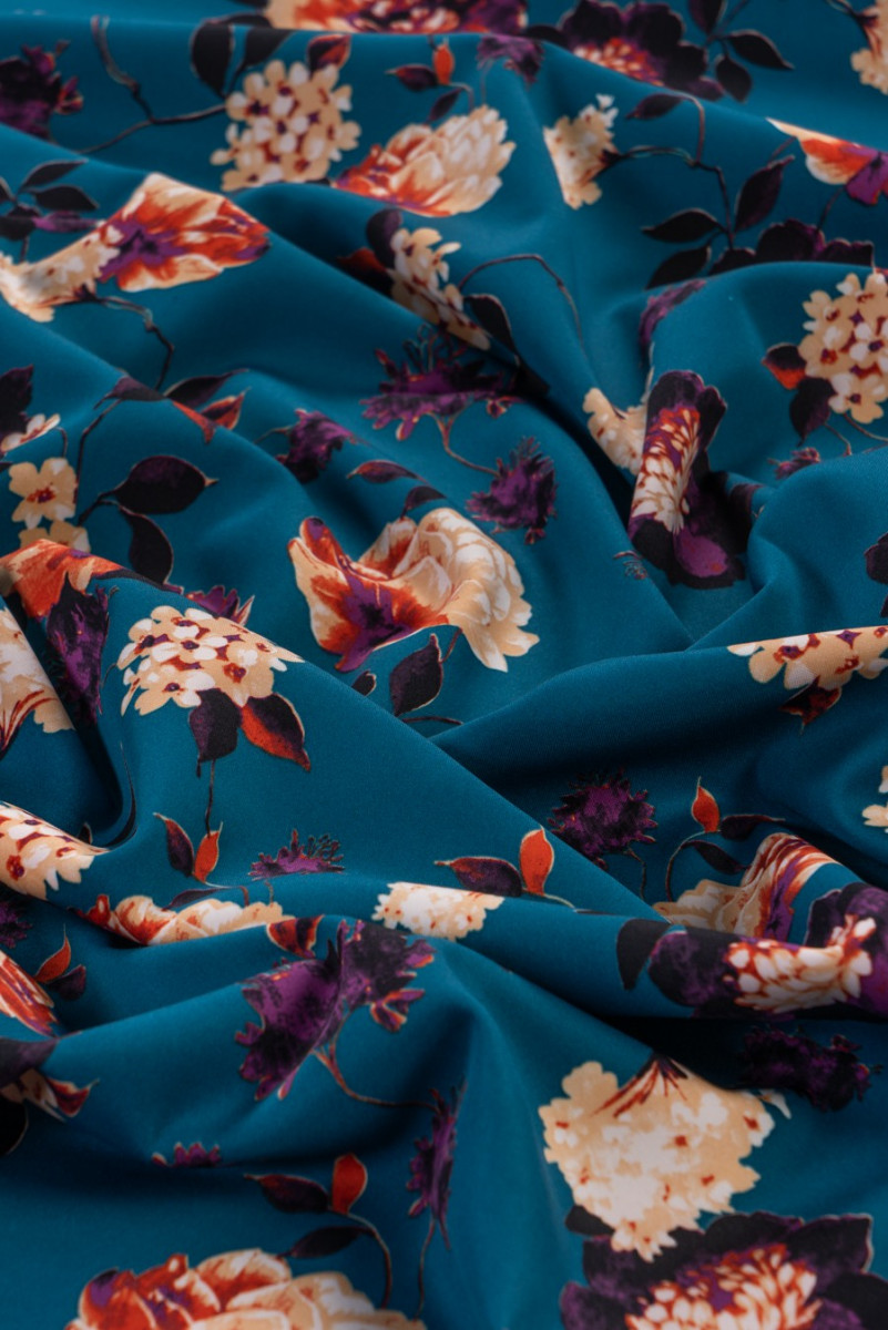 Ujumiskalipso tüüpi silmkoekangas (sukelduja) meresinises sügislilledega. Kangas on elastne, matt, pehmelt eesriided.