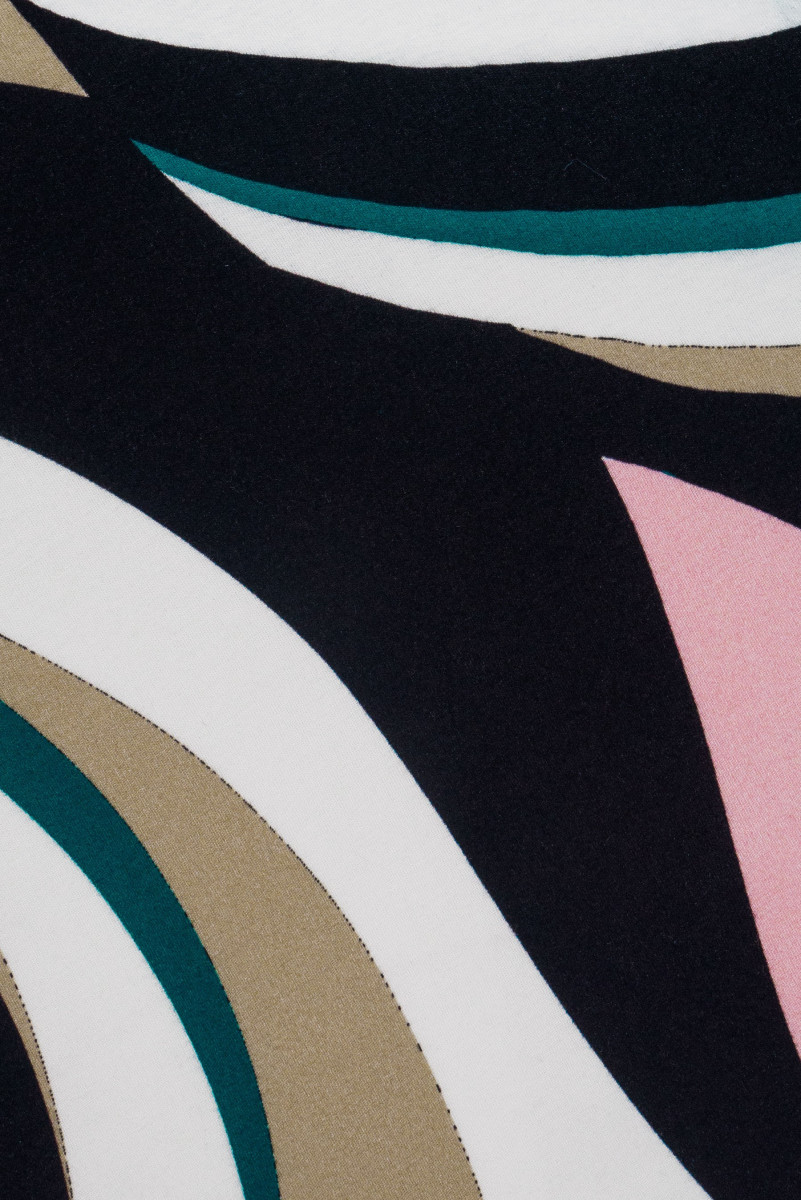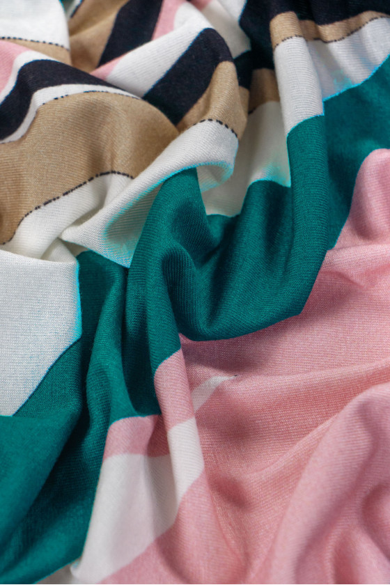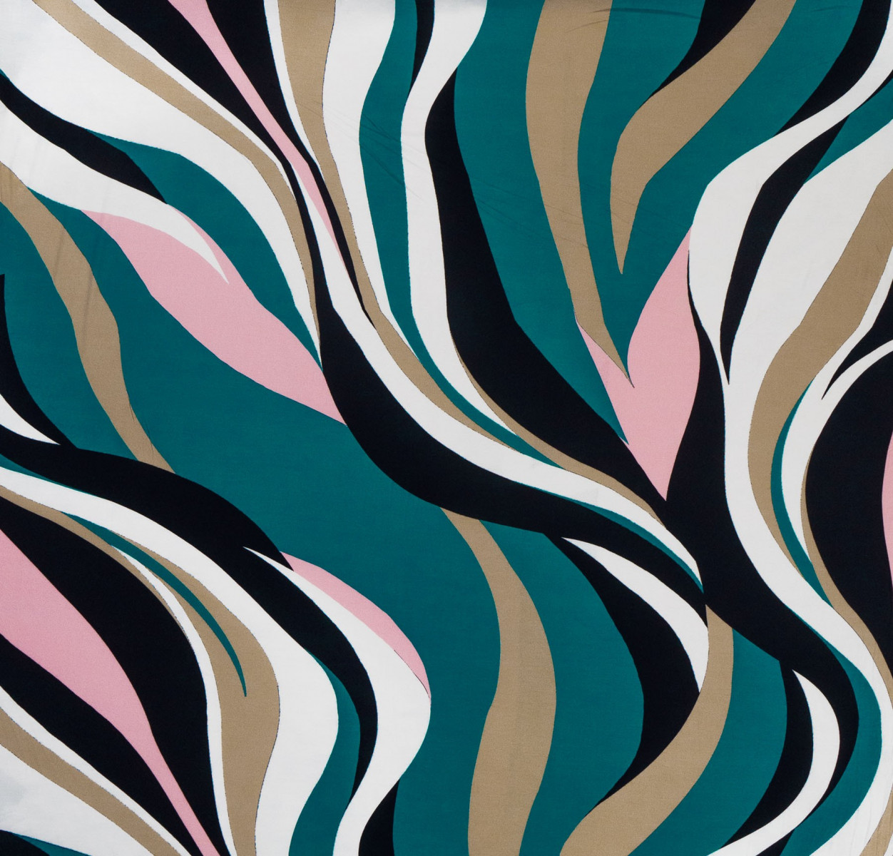 Itaalia 100% viskoosist silmkoekangas, millel on suur "laine" motiiv järgmistes värvides: must, valge, beež, roosa ja türkiissinine. Viskoosist silmkoekangas on looduslik kangas (saadud tselluloosist), väga pehme, õhuline, vastupidav ja vastupidav. Kangas sobib suurepäraselt suvekleidi, pluusi või seeliku õmblemiseks.
