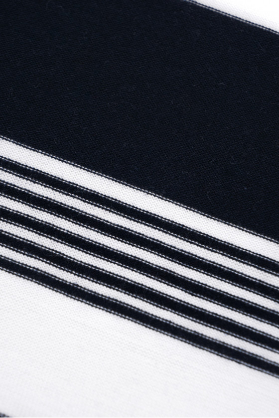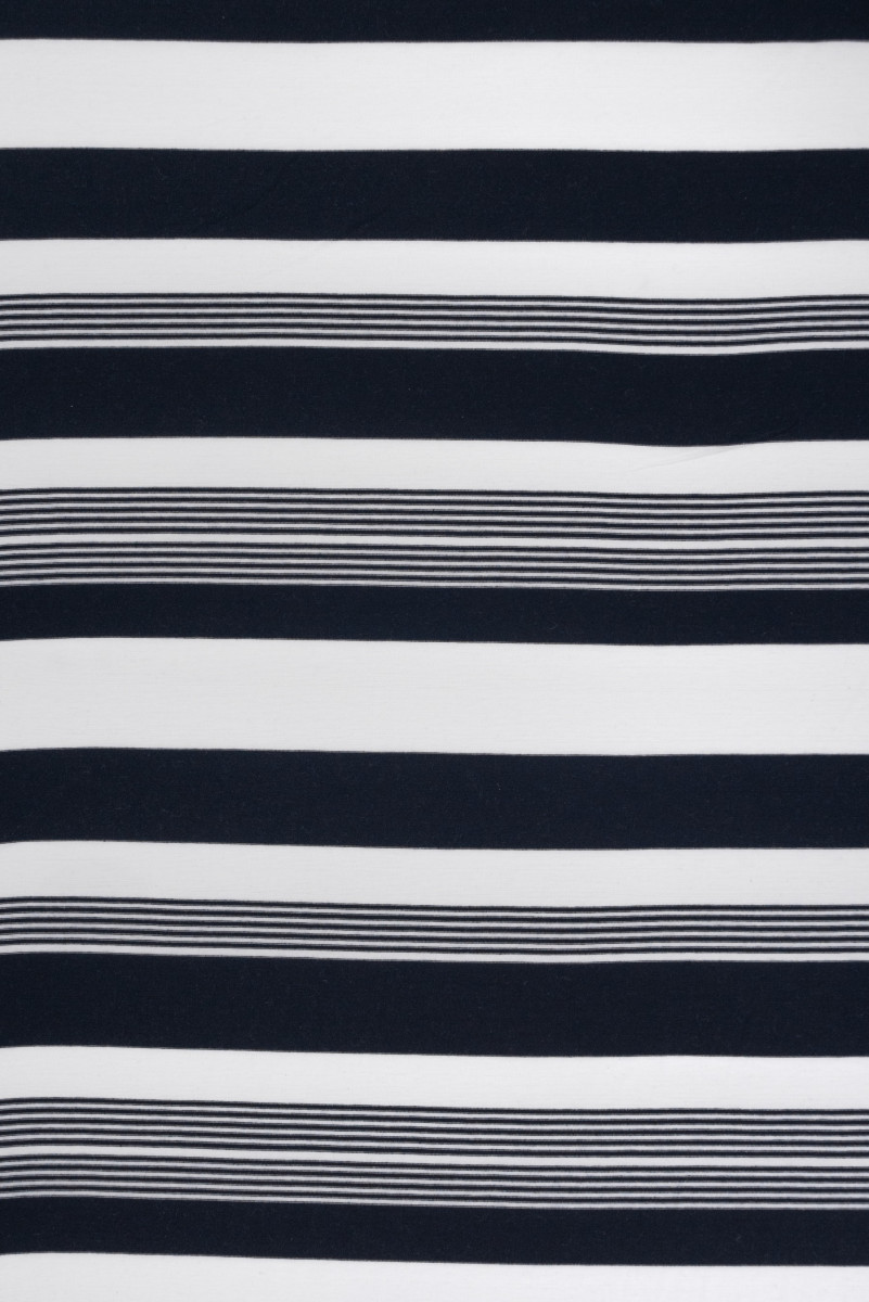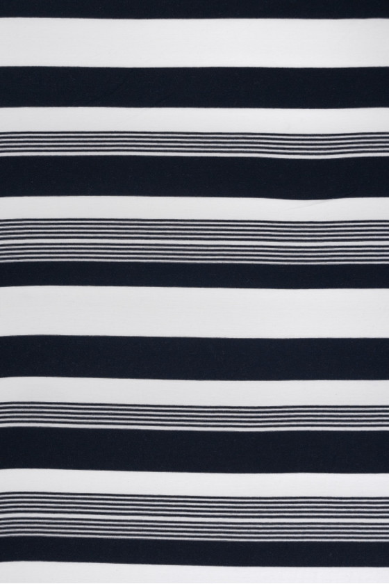 Itaalia viskoosist silmkoekangas, millel on asümmeetrilised triibud mustas ja kreemis. Viskoosist silmkoekangas on looduslik kangas (saadud tselluloosist), väga pehme ja õhuline.