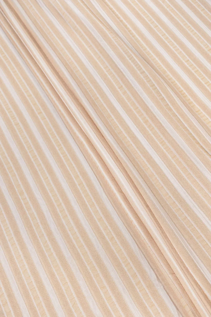 Itaalia viskoosist silmkoekangas lõhevärvi 1 cm laiuste triipudega, vaheldumisi läikiv ja matt. Viskoosne trikotaažkangas on looduslik kangas (saadud tselluloosist), väga pehme ja õhuline. Kangas sobib suurepäraselt suvekleidi, pluusi või seeliku õmblemiseks.