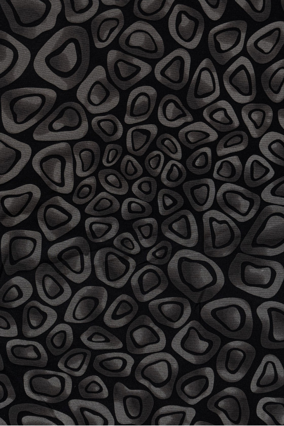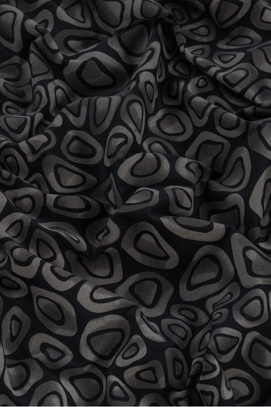 Itaalia jersey atsetaat silmkoekangas mustas tooniga, geomeetriliste mustritega, mis meenutavad umbes 6 cm suuruseid plaastreid. Jersey silmkoekangas on läbipaistmatu, pehmelt drapeeritud silmkoekangas, mida saab õmmelda voodrita.