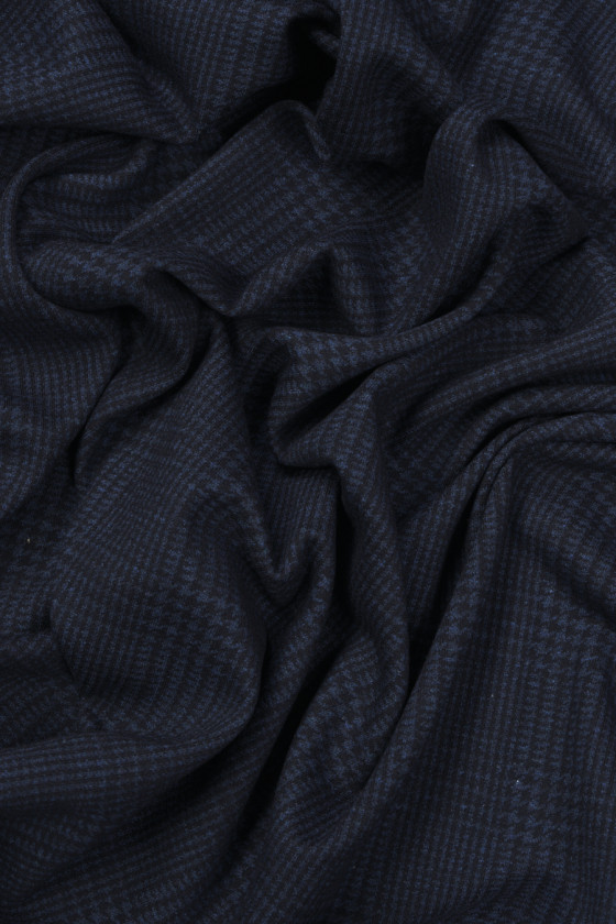 Itaalia jersey silmkoekangas 100% vill musta ja tumesinise kontrollmotiiviga (3,5 cm). Jersey kangas on kattev, pehmelt drapeeritud silmkoekangas, mida saab õmmelda vooderdamata.