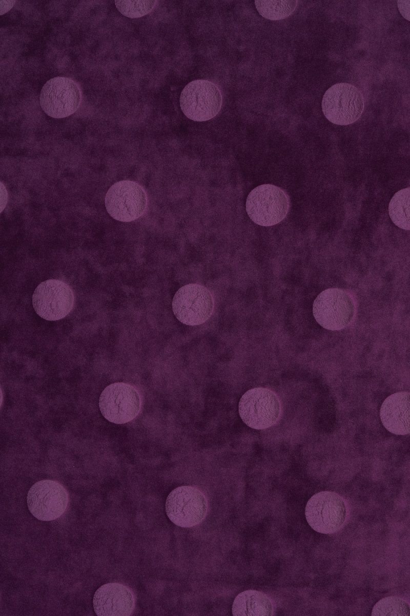 Itaalia veluurne silmkoekangas lilla suure polka punktmotiiviga (2,5 cm). Elastne, lihav silmkoekangas, millel on iseloomulik lühem hunnik.