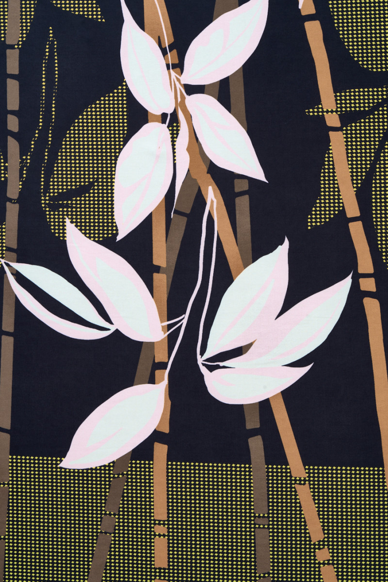 Itaalia polüester silmkoekangas, millel on bambuspostide muster, heleroosad lilled ja rohelised lehed mustal taustal. Silmkoekangas on elastne, puudutatult jahutav, läbipaistmatu, viimistletud õrna läikega - õmbleme selle ümbermõõdu ümber. Huvitav ettepanek kleidi või seeliku loomiseks.