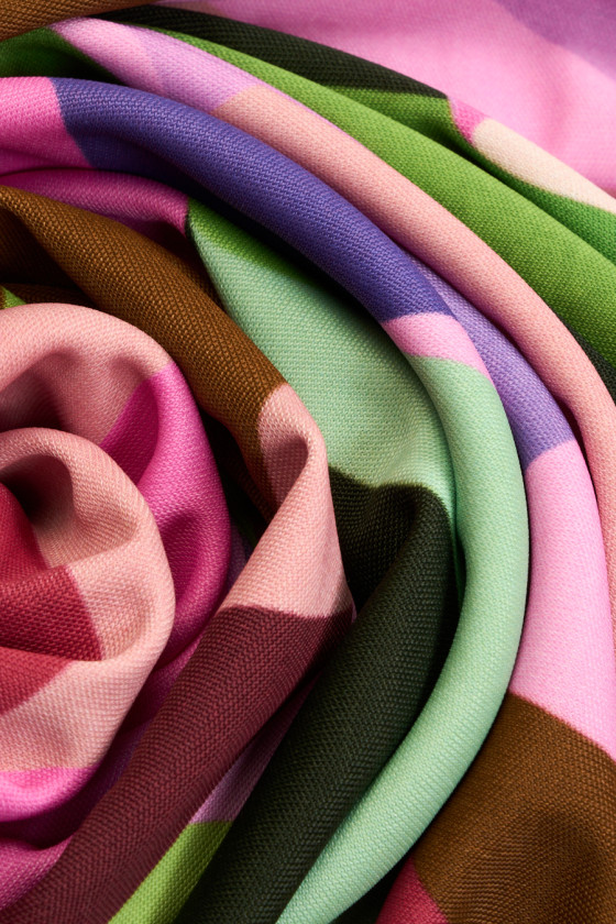 Itaalia viskoosist silmkoekangas värvilise geomeetrilise mustriga. Kangas on lihav, elastne, katsudes jahe, täiesti läbipaistmatu, matt ja sile. Fantastiline pakkumine suveriietele, nagu kleidid, pluusid, seelikud, lühikesed püksid või püksid.