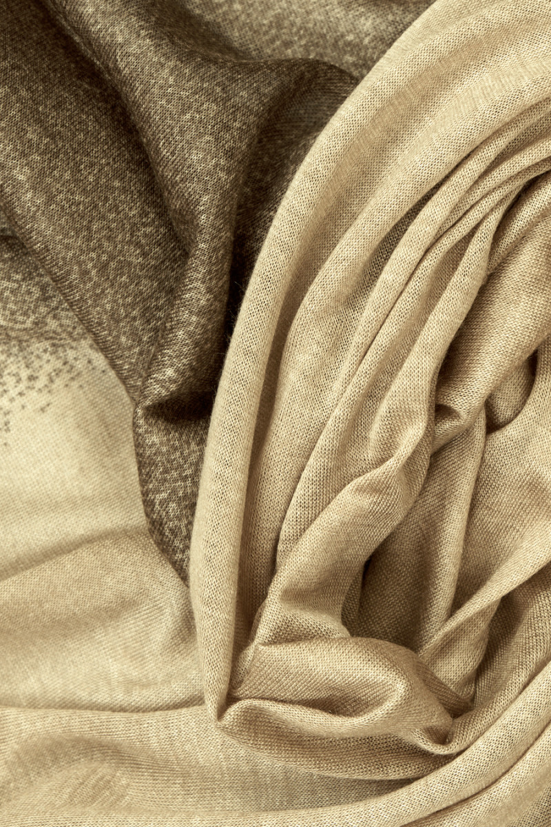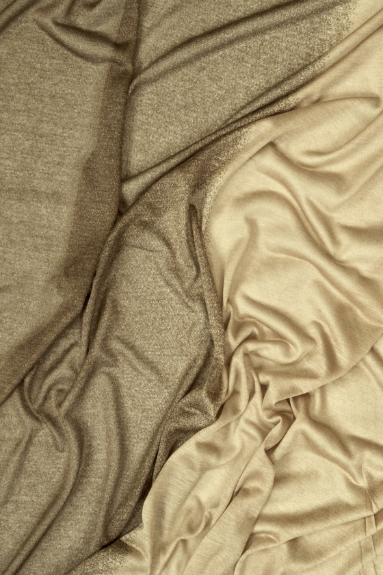 Itaalia silmkoekangas, mis on varjutatud beeži ja oliivivärviga. Silmkoekangas on kergelt läbipaistev, õhuke, pehme, meeldiv puudutada ja elastne. Materjal, mis on mõeldud pluuside, T-särkide, t-särkide jaoks.