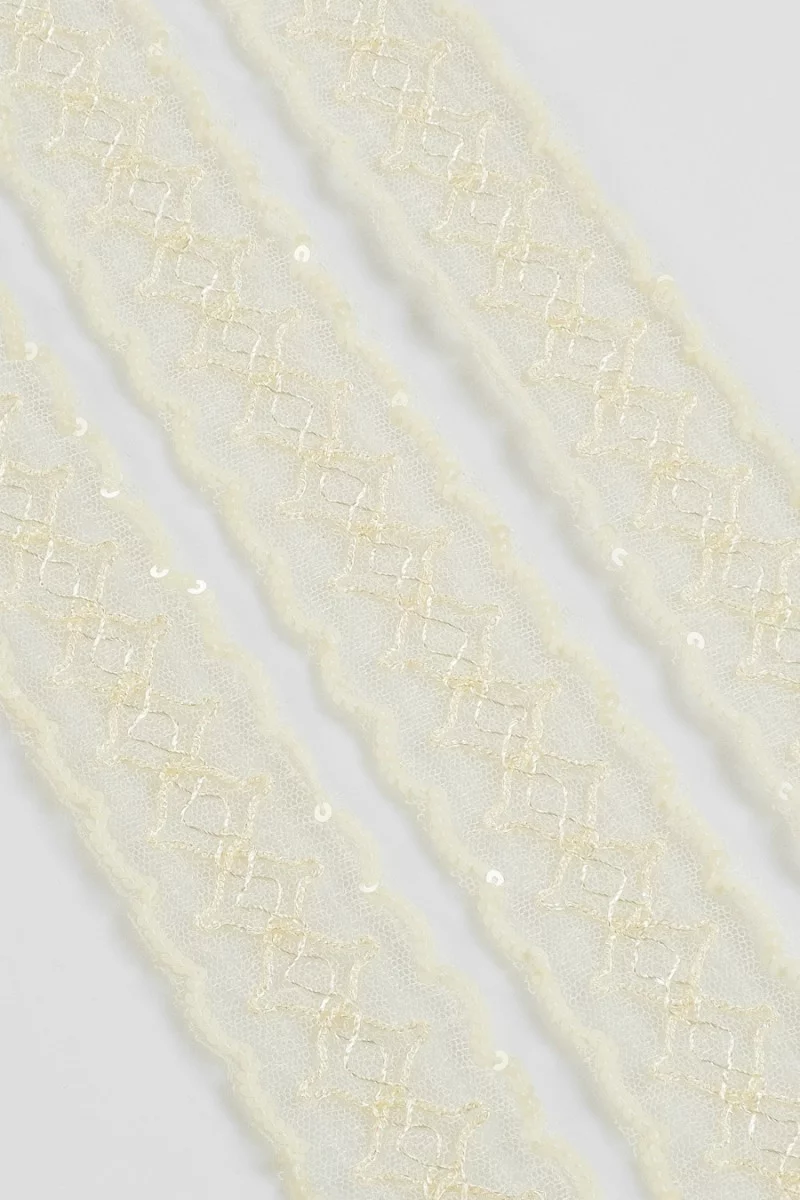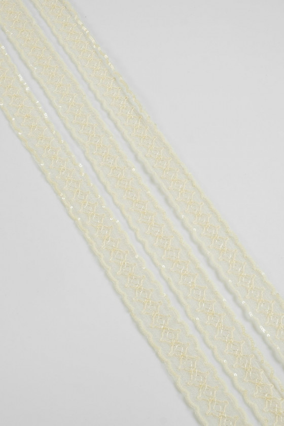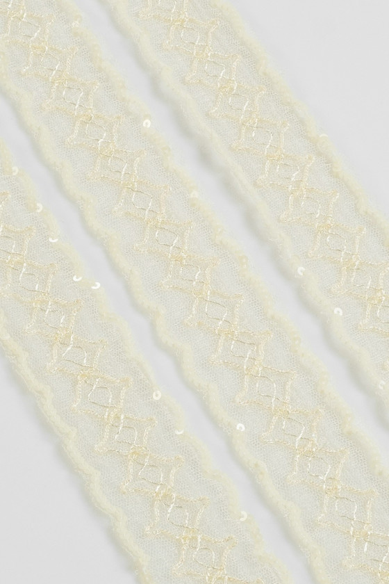 Tüllile on tikitud litrid ja helmed. Lint on umbes 4 cm lai. Ideaalne kleitide, seelikute või pluuside viimistlemiseks.