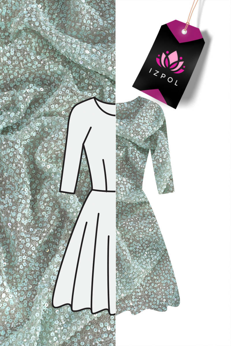 Itaalia kangas (võrk) heleda piparmündi värviga, rikkalikult kaunistatud valgete ja läbipaistvate helmeste ja matt-piparmündivärviliste litritega, kogu on lõigatud hõbedase lurex-niidiga. Kangas on läbipaistev (vajab vooderit), raske, kergelt elastne. Fantastiline ja väga tõhus ettepanek õhtukleidi, seeliku või pluusi õmblemiseks. Koostis: 100% polüester