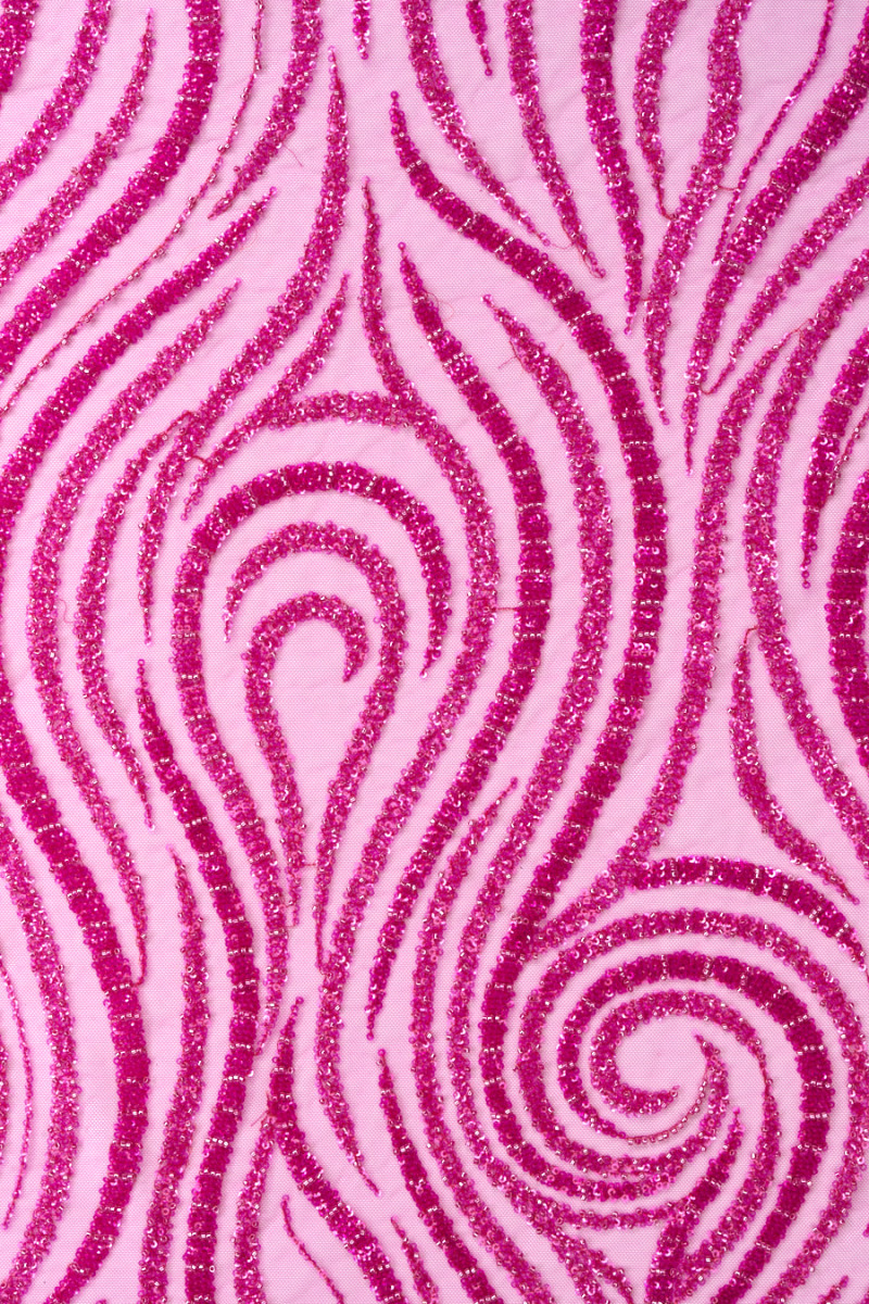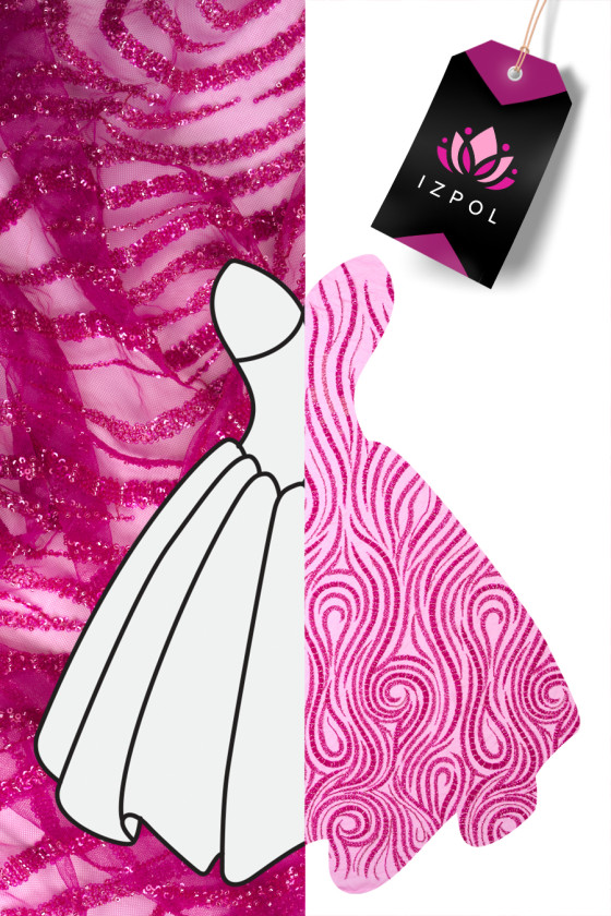 Itaalia õhtune kangas fuksias. Sama värvi jäik tüll on rikkalikult kaunistatud helmeste ja litritega, mis on paigutatud lainete kujul. Nad paksenevad kanga ühe serva suunas - õmbleme selle ringikujuliselt. Fantastiline ettepanek õhtukleidi õmblemiseks kõige moodsamas värvitoonis. Kangas inimestele, kes järgivad uusimaid moesuundi.