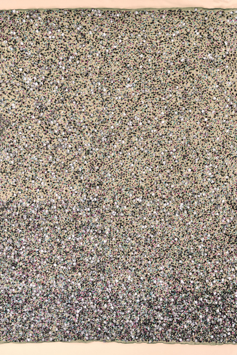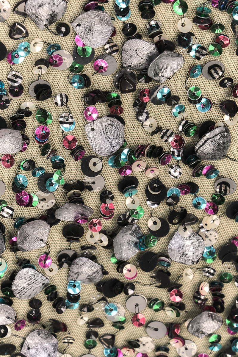 Itaalia jäik tüll, millel on klassikalised aasad pudelirohelises. See on väga rikkalikult kaunistatud fuksia, rohelise, türkiissinine, musta ja halli kestaga litritega, mille läbimõõt on umbes 1 cm. Litrid ja kestad paksenevad kanga ühe serva suunas - õmbleme selle ringikujuliselt. Kangas on väga tõhus, läbipaistev (vajab vooderit), raske ja elastne. Fantastiline ettepanek õhtukleidi, seeliku või pluusi õmblemiseks väga huvitavas väljaandes.
