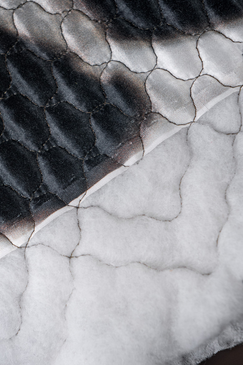 Viimane kupong huvitavast kahepoolsest tepitud kangast. Ühelt poolt suurte tumepruunide laikude mustriga valgel taustal, teiselt poolt ilma halli ja kivise mustrita.