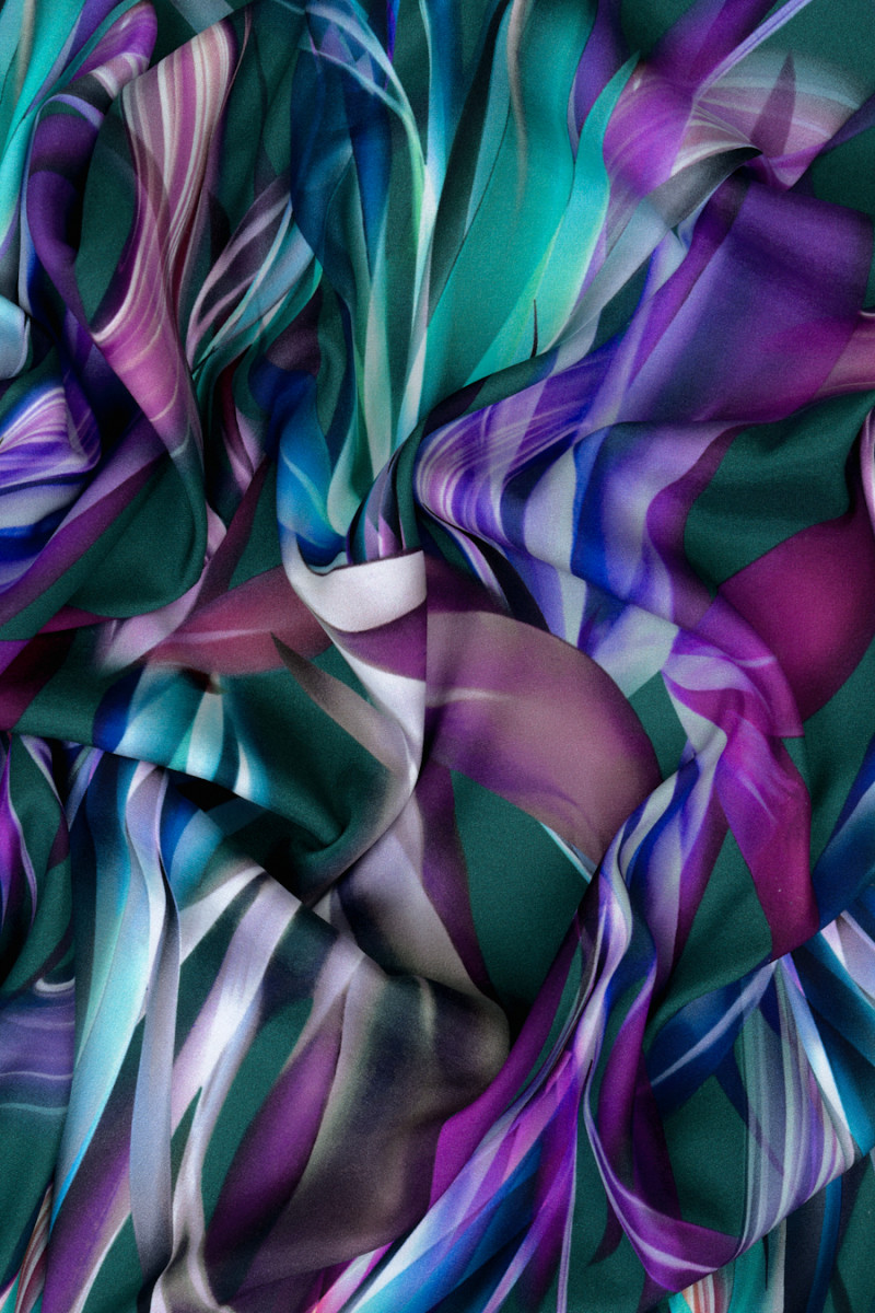 Itaalia siidist satiin, elastne piklike lehtede motiiviga tumerohelisel taustal. Tihedalt valmistatud rukkilille-, lilla-, fuksia- ja teevärvides muster annab kangale ilusa ilme - trükk on tehtud mattpoolsel küljel.