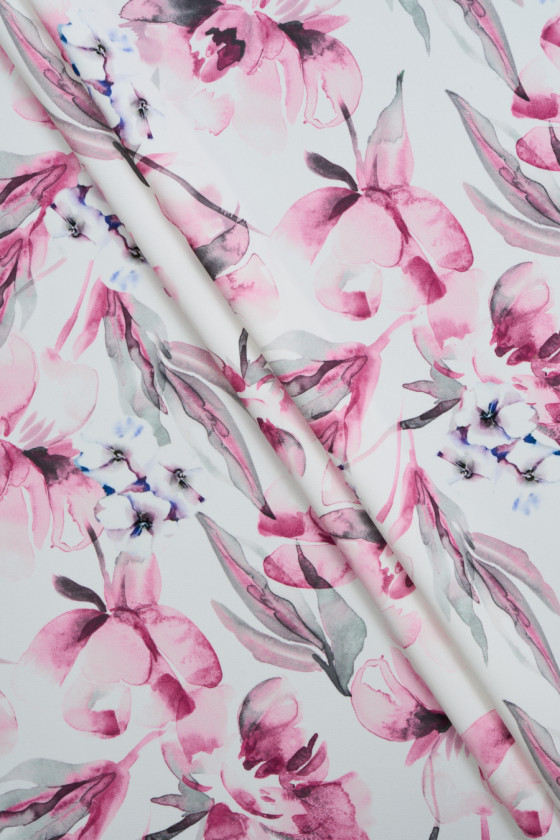Itaalia cadi polüesterkangas roosade lillede motiiviga valgel taustal. Tihe muster on veidi hägune, mida täiendavad hallid värvid, tänu millele saab see unikaalse välimuse. Kangas on lihav, voolav, sile, tihe kudumine, kergelt elastne. See sobib suurepäraselt seeliku, kleidi ja kostüümi õmblemiseks. Fantastiline pakkumine inimestele, kellele meeldib lillekujundus.