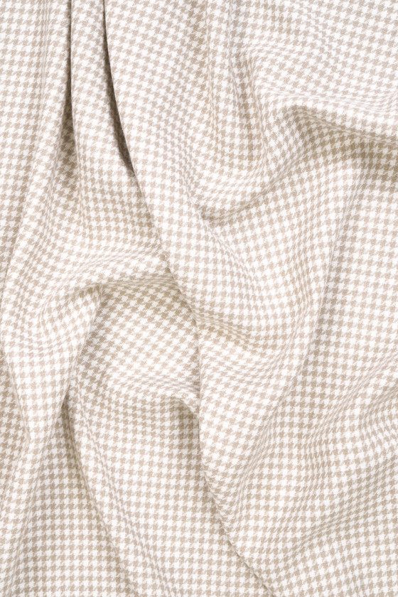 Itaalia puuvillane kangas lina ja polüestriga väikese kana jalamotiiviga beežis ja koores. Kangas on lihav, elastne, kergelt lahtine kudumine, kuid täiesti läbipaistmatu. Klassikaline pakkumine pükstele, jakkidele, kleitidele, seelikutele ja lühikestele pükstele.