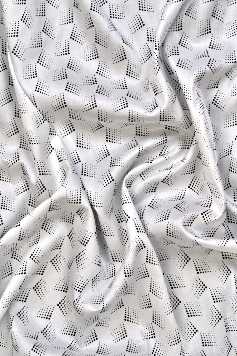 Itaalia särgikangas, 100% lüocell väikeste ruutude motiiviga, mis on valmistatud mustadest punktidest valgel taustal. Muster on tihe, mustad täpid lähevad väiksemast suurusest suuremaks. Kangas on õhuke, üsna läbipaistmatu, pehme, väga meeldiv puudutada ja töötab kergelt kiududel. See sobib suurepäraselt särkidele, pluusidele, kleitidele ja lühikestele pükstele.