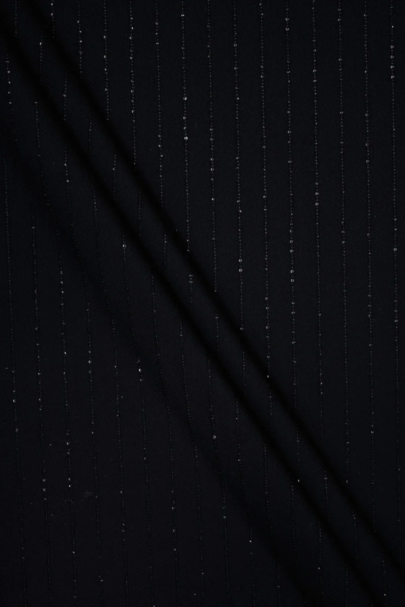Itaalia kostüümikangas mustas toonis kitsa triibulise motiiviga. Rihmad asetatakse regulaarselt 1,5 cm kaugusele ja kaunistatakse väikeste litritega, ühe riba laius on 2 mm. Kangas on keskmise paksusega, pehme, läbipaistmatu, valmistatud õrnast twill-kudumisest ja niididest veidi elastne. Suurepärane valik jope, pükste, kleitide või seelikute jaoks.