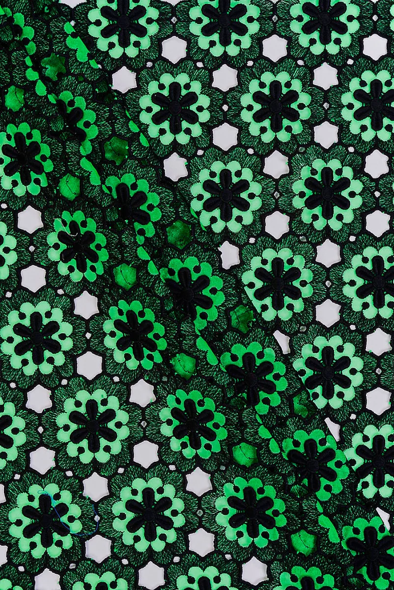 Originaalne gipüür pits, mis loodi 7 cm suuruste lillede kombinatsioonist. Siidist rohelisele orelile on tikitud must lillemuster. Iga elemendi keskel on lõdvalt õmmeldud must viskoosõis suurusega 4 cm. Kangas on lillede kohtumiskohas läbipaistev, elastne ja üsna jäik. Pitsi laius on 60 cm. Soovitame seda korsettide, lihtsate seelikute õmblemiseks või dekoratiivkangana.